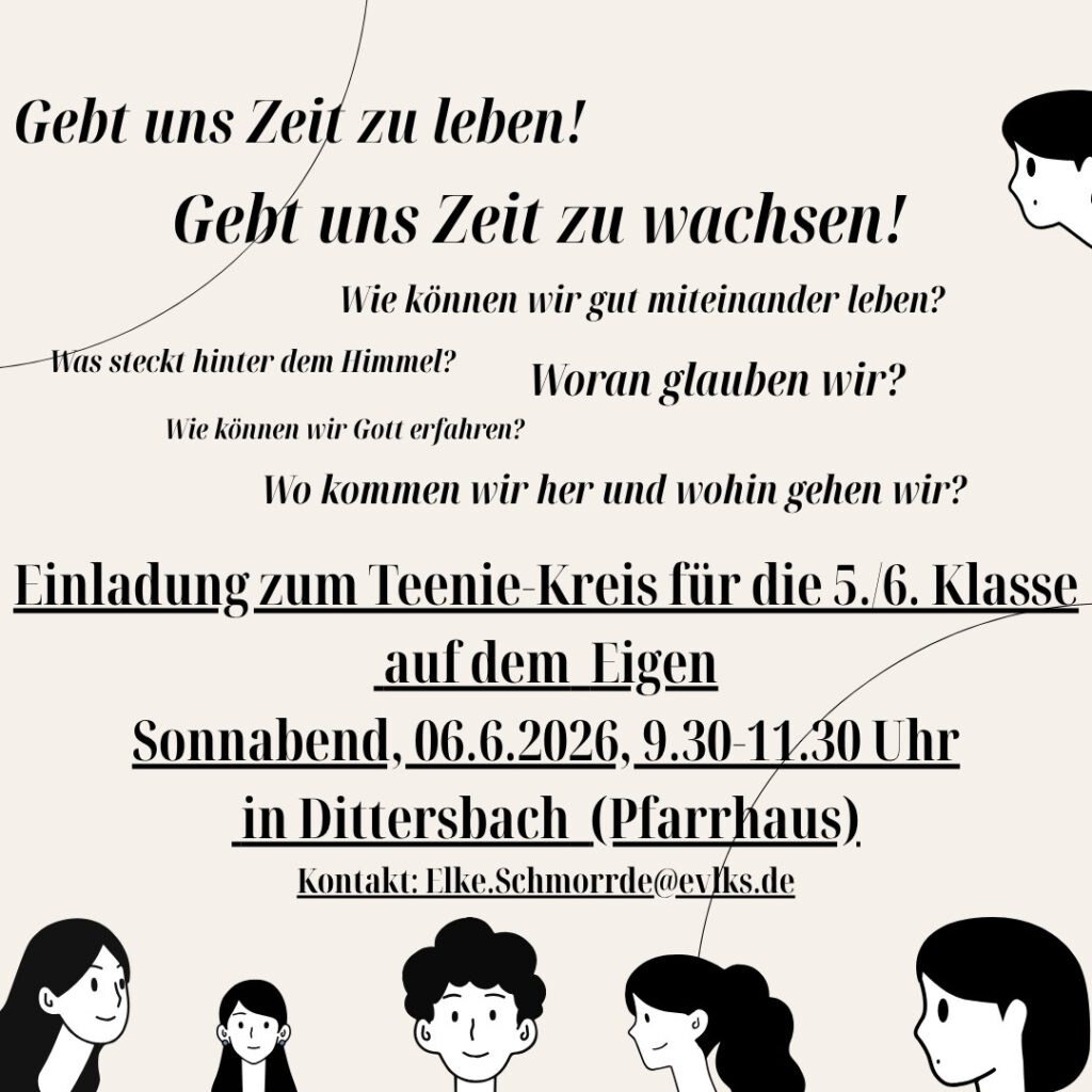 Am Dienstag, dem 7. Juni, werden wir zu unserer diesjährigen Gemeindefahrt unterwegs sein. Diese führt uns in den Bibelgarten von Oberlichtenau, wo die Geschichte des Volkes Israel und das Leben von Jesus Christus ganz greifbar und nachvollziehbar werden. Zum Mittagessen und Kaffeetrinken werden wir unterwegs einkehren – und auch eine schöne Kirche aufsuchen, in der wir miteinander eine Andacht feiern. Genauere Zeiten für die Tagesfahrt werden noch bekannt gegeben. Anmelden können Sie sich jedoch schon bei uns Pfarrersleuten oder im jeweiligen Pfarramt – auf das der Bus voll werde! Als Kosten sind 40,00 € bitte einzuplanen. Wir freuen uns auf einen guten und segensreichen gemeinsamen Tag. (D. Markert, J. Hahn)